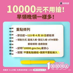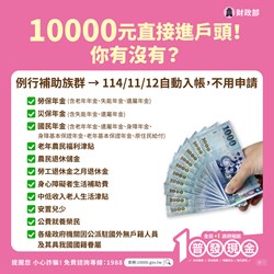 二、「全民+1 政府相挺」普發現金發放作業自114年10月23日起正式啟動,財政部為使民眾瞭解普發現金領取方式,已建置普發現金網站,(網址: https://10000.gov.tw)。
