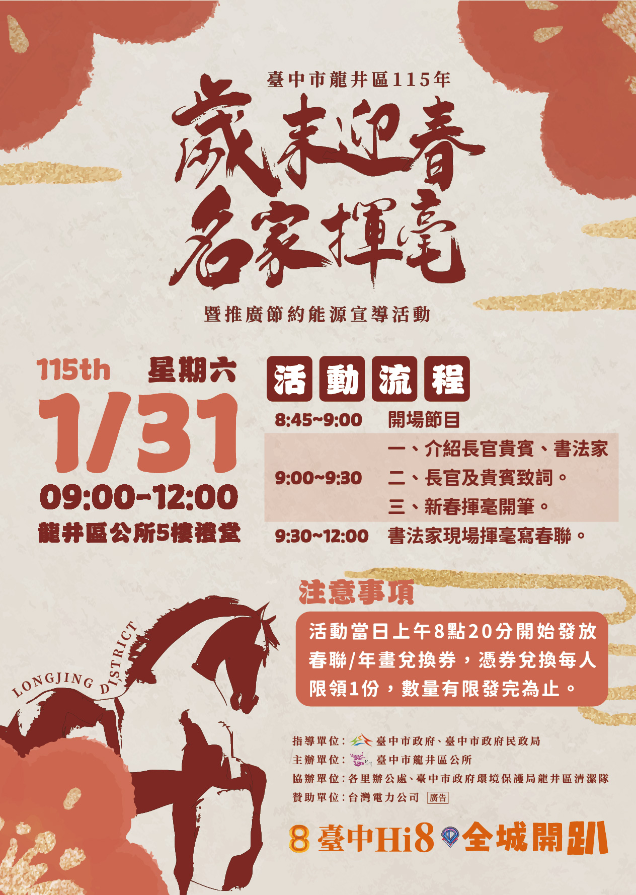 一、旨揭活動謹訂於115年1月31日(星期六)上午9時至12時 ,於龍井區公所5樓禮堂舉辦。